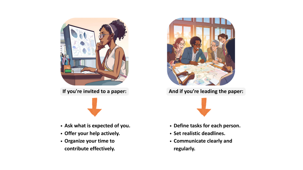 Invite people with different experiences, backgrounds, identities, and perspectives to collaborate. Diversity enriches any project, but inclusion is what ensures that each voice is truly heard and valued. Creating a welcoming space where collaborators feel respected and encouraged to contribute authentically can transform the quality and depth of your work. Some of my best papers came from diverse and inclusive teams that challenged my assumptions and broadened my perspective. It’s also essential to be transparent, communicate clearly from the beginning what kind of contribution you expect, what deadlines you’re working with, and what kind of collaboration environment you aim to foster. Keep in mind that it’s common for someone to decline an invitation. Thank them respectfully and move on. The same applies if someone steps down because they couldn’t meet the commitment, respect their honesty and honor their choice. Respect is the cornerstone. Never tolerate disrespect or personal attacks. I’ve learned that even with disagreements, everything can be resolved with professionalism. And if not, learn to step away respectfully.