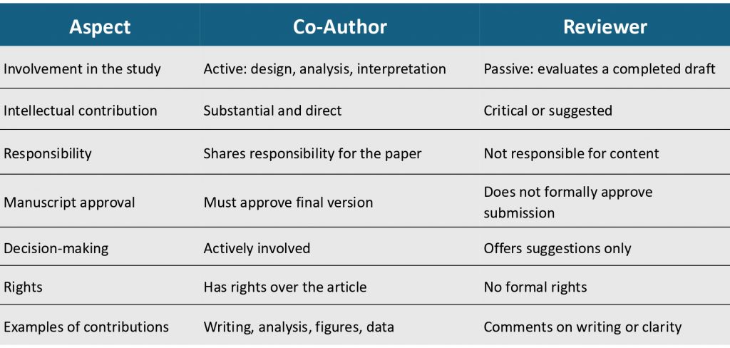 A common misunderstanding in academia is equating the role of a co-author with that of a reviewer. They are not the same. Many co-authors focus on superficial edits: fixing commas, replacing synonyms, or writing “(reference)” without adding the actual reference or, as happened to me once, leaving a comment like “you could write something here” without writing it themselves. While this can be helpful, the actual value of co-authorship lies in contributing to the content: ideas, interpretation, analysis, and writing. Here’s a table summarising the differences: